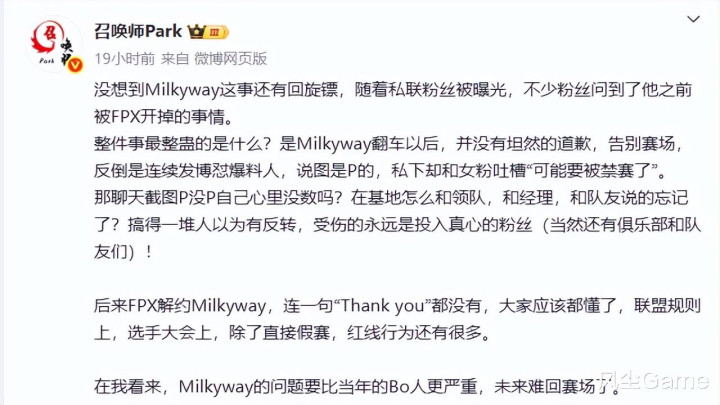 LOL世界赛休赛期,前FPX打野选手Milkyway,近日突然空降热搜,一位自称银河女粉的网友发文爆料,银河在第二赛段期间,主动私下联系自己,两人快速发展成男女朋友关系(女粉单方面认为),甚至还在线下开了几局,恋情持续了3个月,银河就被爆涉嫌假赛,随后两人关系结束。